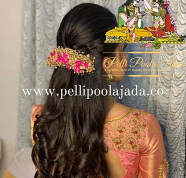Nowdays mehendi and sangeeth events are most trending. For these events most of the brides prefer hair knots for more charming look and comfort. Here we use baby breath flowers along with peach and pink carnesian to get exact matching with brides outfit.