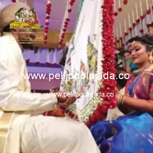 .BRIDE AND BRIDE GROOM UREGIMPU DESIGN ON RAW SILK FABRIC WITH FOUR SIDES BORDER AND TASSELS TO CARRY.