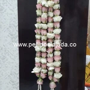 .GARLANDS MADE WITH LIGHT PINK ROSES AND WHITE ROSES ARE USED.