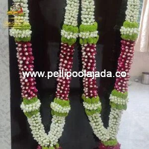 .GARLANDS MADE WITH RED ROSE PETALS, WHITE BUDS ON RED ROSE PETALS AND GREEN CHRISANTHAMUM FLOWERS.