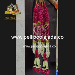 .IN HANGINGS GOLD BEADS, WHITE ROSES AND GREEN LEAFS AND STRAWBERRY ROSE PETALS ARE USED.