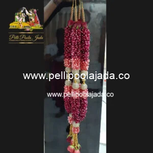 .GARLANDS MADE WITH RED ROSES, WHITE BUDS IN ROSE PETALS AND ORANGE ROSE PETALS WITH ARTIFICIAL DECORATIVE BALL ARE USED.